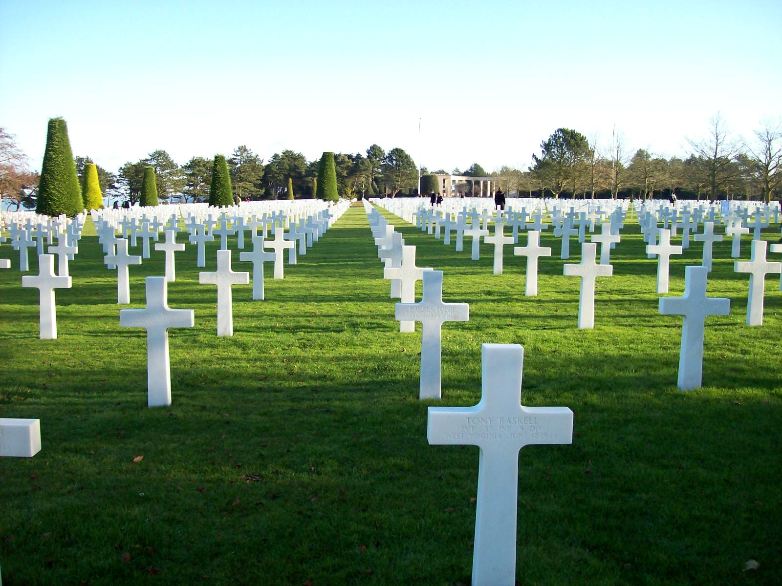 cider and calvados, called "aperitif" (16%). We placed pins into our home towns on his world map, as the cider-maker told us of his dream to visit New Zealand. The next stop was the American cemetery. This was far more impressive than Andrew had expected. It is immaculately groomed and well
