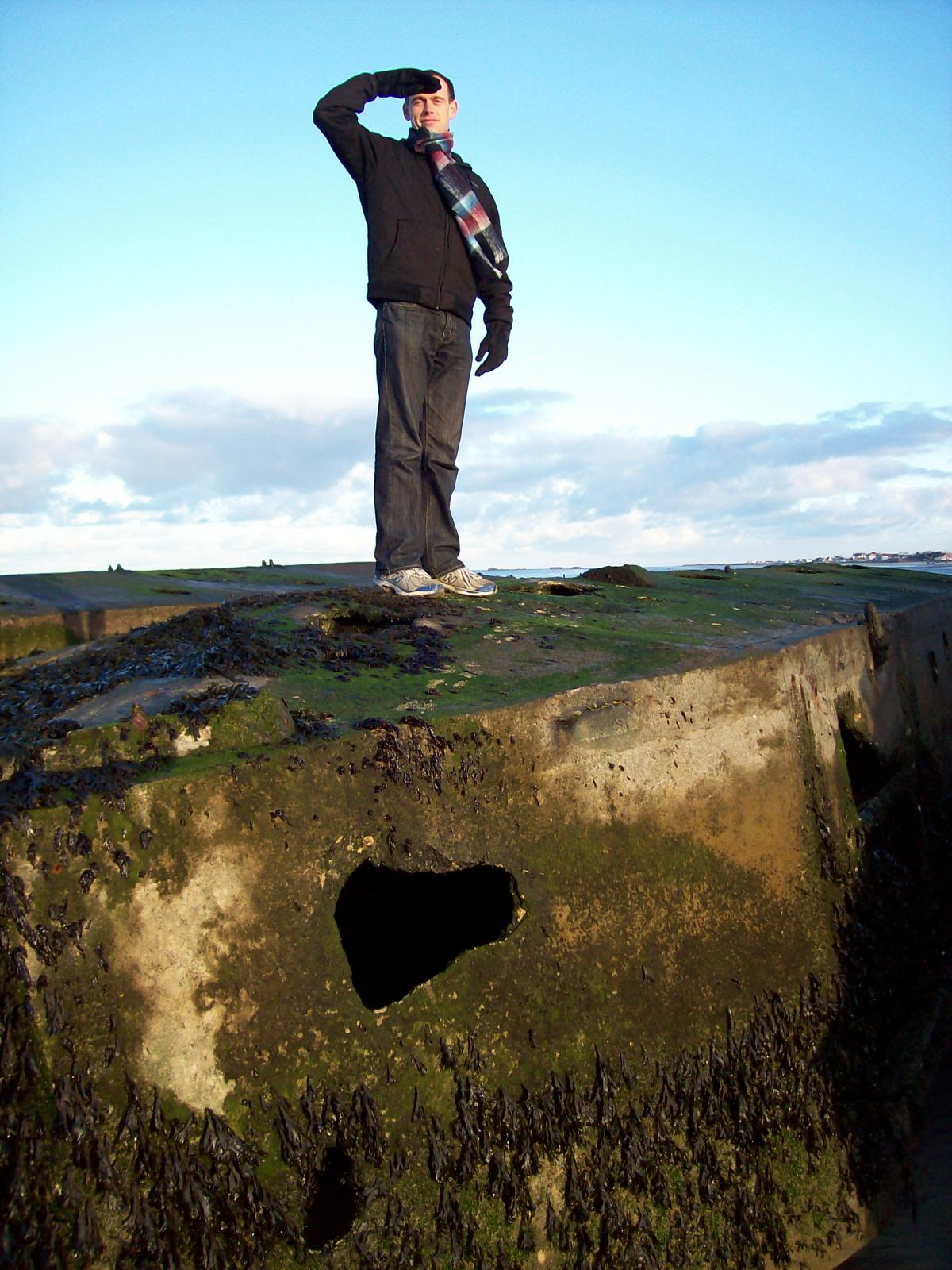 restored freedom to Europe. We continued eastwards to the artificial harbour created by sinking concrete boats to make breakwaters. Luckily for us it was low tide and we had an excellent view of them. We even climbed on top of one to look down into the storage compartments of the thing, before reading on the side not to do what we had just done! |