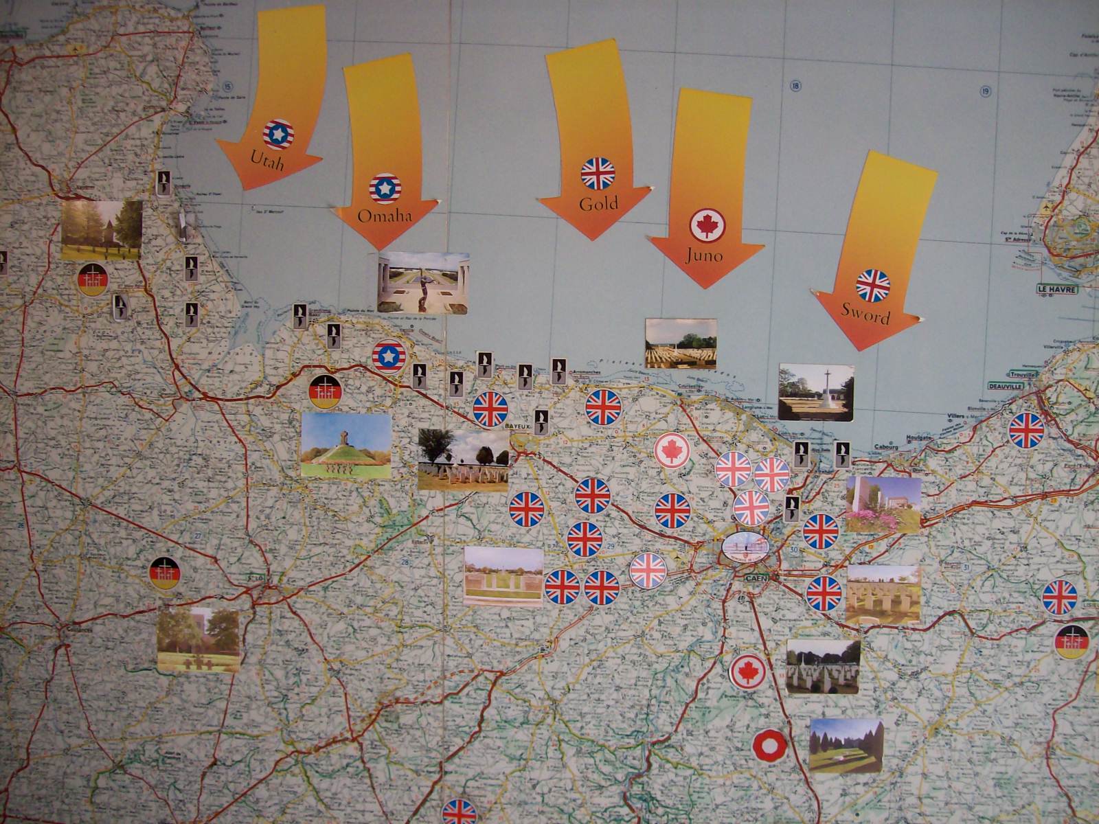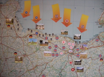 cider and calvados, called "aperitif" (16%). We placed pins into our home towns on his world map, as the cider-maker told us of his dream to visit New Zealand. The next stop was the American cemetery. This was far more impressive than Andrew had expected. It is immaculately groomed and well