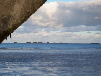 restored freedom to Europe. We continued eastwards to the artificial harbour created by sinking concrete boats to make breakwaters. Luckily for us it was low tide and we had an excellent view of them. We even climbed on top of one to look down into the storage compartments of the thing, before reading on the side not to do what we had just done! |